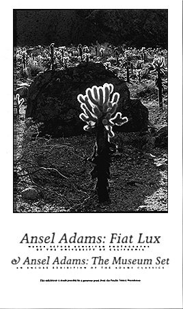 POSTER: FIAT LUX SERIESANSEL ADAMSTITLE: "CHOLLA, ROCK, INTO SUN"DESCRIPTION: RARE, OUT OF PRINT, AND HIGHLY SOUGHT AFTER EXHIBITION POSTER.Copyright ® 1990 by The Regents of the University of California. Printed by Gardner Lithograph, Buena Park, CA. Overall dimensions: 24 inches by 36 inches. The photo displayed does not do justice to the fine printed image which is flawless with precise detail and nuance of shading from black to grey to white, the full range which Adams Adams sought to reveal in his photographs. In the early 1960s the President of the UC system, Clark Kerr, approached Ansel Adams about doing a project to mark the centennial celebration of the founding of the University of California which would occur in 1968. Kerr was familiar with the photographic work of Adams and wanted Ansel to capture the breadth and diversity of the UC system with its campuses, natural reserves, laboratories, and research stations. Ansel agreed and suggested that his collaborator, Nancy Newhall, write the text for the planned book which was published by the McGraw Hill Book Company. The agreement with Adams also specified that a quantity of fine prints covering the project would be given to the University. The collection of 605 fine prints remained in the archive at the Bancroft Library in Berkeley and were not exhibited publicly until an exhibition was mounted by the University of California, Irvine via the generosity of a funding grant from the Pacific Telesis Foundation. That grant allowed the exhibition of one hundred prints from the collection which toured six campuses in the UC system and The Oakland Museum. Pacific Telesis also lent their collection of Ansel Adams prints known as "The Museum Set" which accompanied the touring exhibition. Read more...